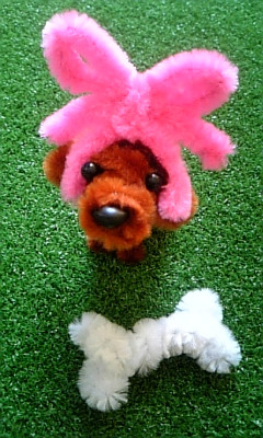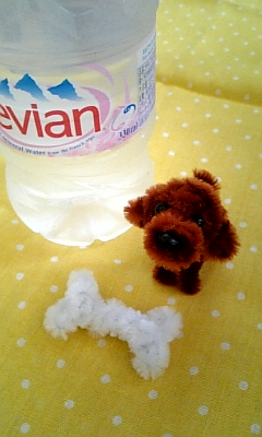 インストラクターと一緒に、プードルと、持ち物のリボンと骨を作ります。