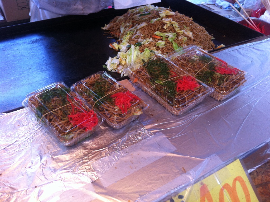 たこ焼き、イカ焼き、カルビと黒豚の串焼き、焼きそば…